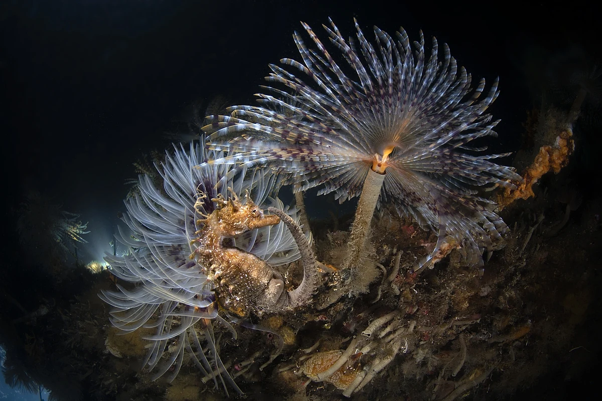 Sabella pavonina, commonly known as the peacock worm, is a species of marine polychaete worm in the family Sabellidae. It can be found along the coasts of western Europe and the Mediterranean Sea, in shallow, tidal waters with a bed of mud, sand or gravel. The worm is 10 to 25 centimetres (4 to 10 inches) in length, with its body divided into 100 to 600 small segments. The head has two fans of 8 to 45 feathery radioles arising from fleshy, semi-circular lobes. The body is mostly grey-green while the radioles are brown, red or purple with darker bands. This group of S. pavonina worms was photographed with a short-snouted seahorse in a protected marine natural area near Porto Cesareo, Italy.